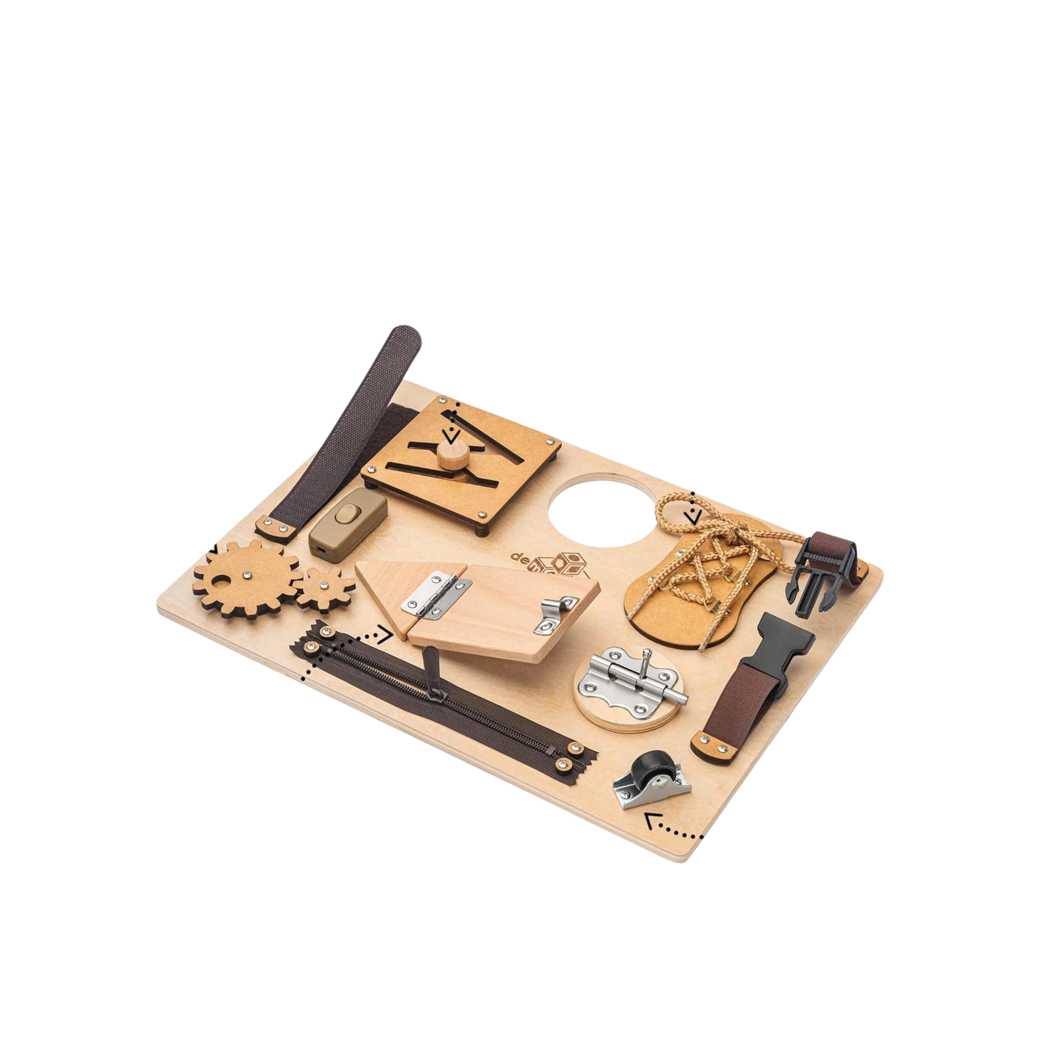 - Montessori Busy Board for Toddlers - Our sensory board for toddlers features 10 engaging activities for fine motor skills, problem-solving, and cognitive growth. Designed for preschool learning, it helps kids practice essential life skills like zipping and tying. Lightweight and travel-friendly, this toddler busy board is perfect for screen-free play at home or on the go.
