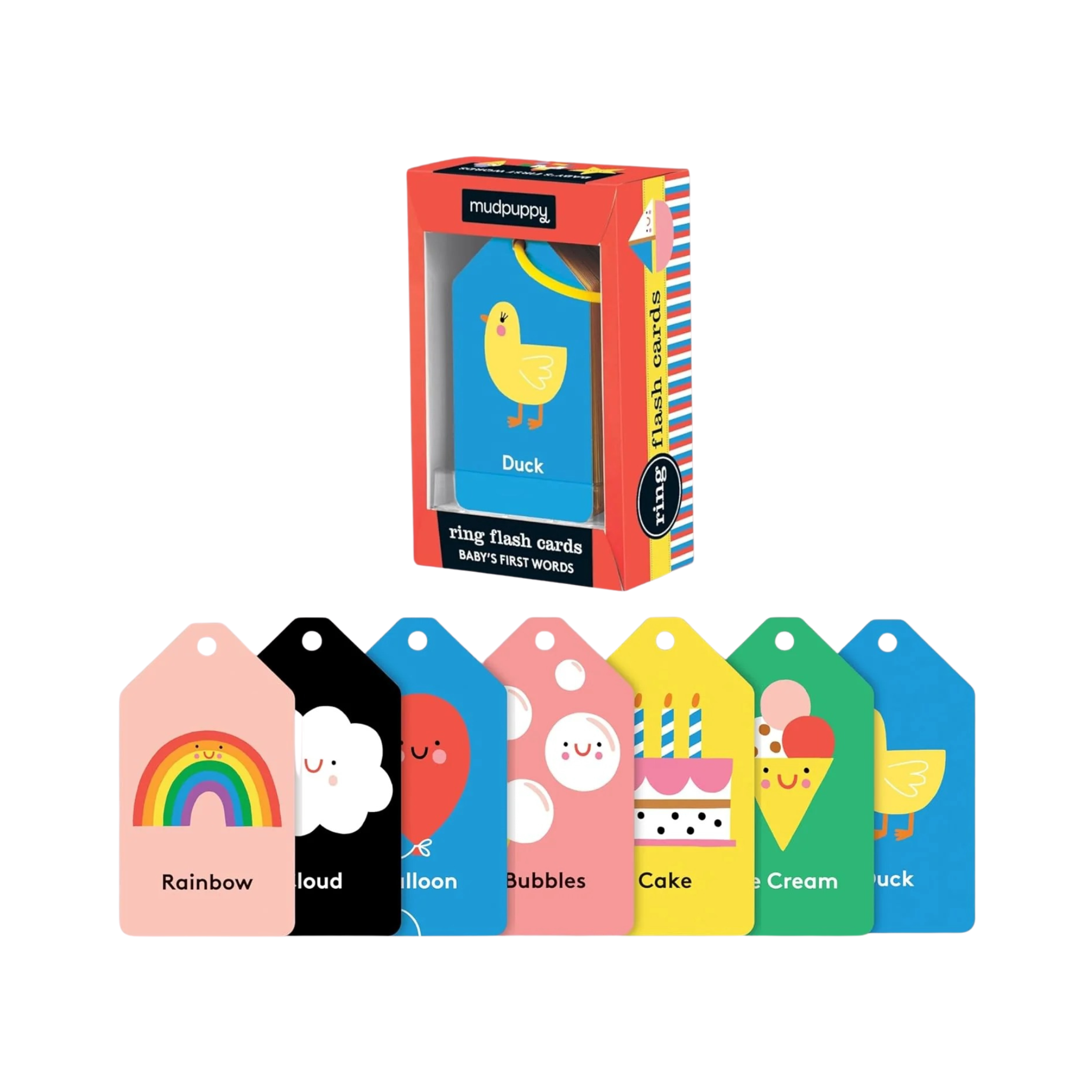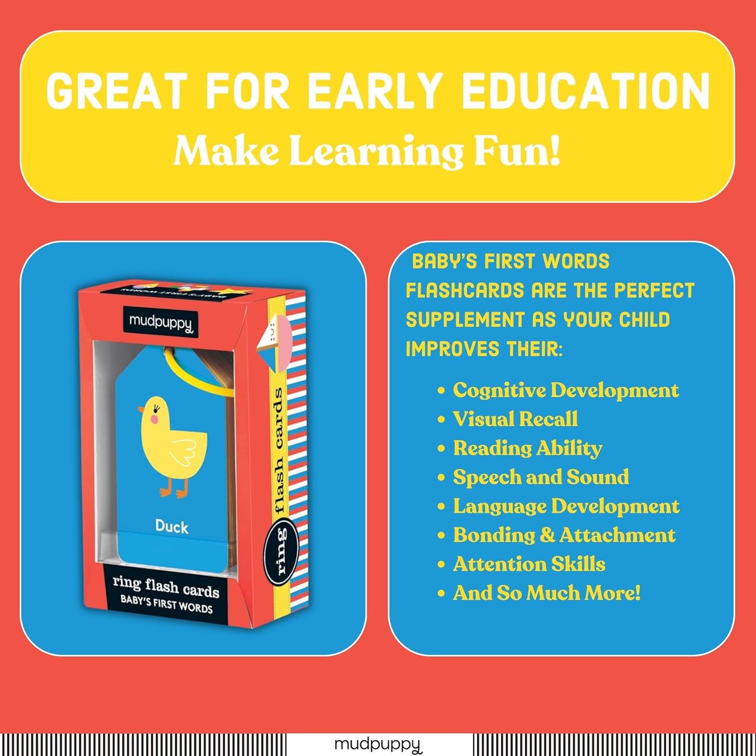 Want to increase your toddler’s vocabulary? Make it interactive with a fun game of flash cards! Your child will gradually learn to associate each illustration on these 26 cards with its appropriate name, thereby expanding the words they can say. You may even notice your child saying these words when they spot the item in everyday life. Each of the two-sided flash cards features cute illustrations on both sides. The 26 toddler flash cards fit on a plastic ring that you can remove if your child wants to sort the cards or play with them in another way. There are so many possibilities! These flash cards can also be used as playroom or classroom decorations. Best of all, these flash cards encourage interaction while learning. Your child has the opportunity to engage with you or another loved one while learning some of the foundational words in the English language. Turn learning into a game using your imagination and watch as your child has fun while building a lifelong skill. Plus, the reclosable ring makes this the perfect car or airplane activity for kids. For over 25 years, Mudpuppy has created quality non-digital puzzles, games and toys for children and families that facilitate creative play and imaginative thinking. All Mudpuppy products adhere to CPSIA, ASTM, and CE Safety Regulations.